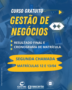 A Comissão responsável pela ação de extensão – Curso Gestão de Negócios divulga o resultado final e os candidatos sorteados, em segunda chamada, aptos a se matricularem.