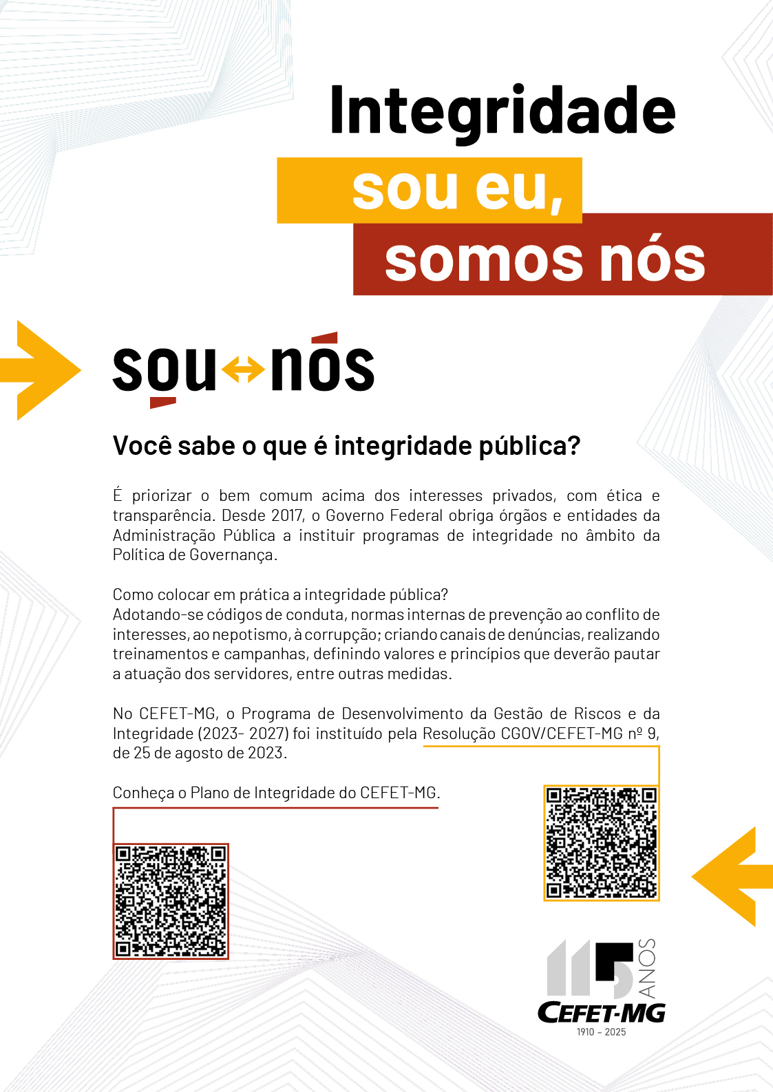 O objetivo é fomentar a importância de se adotar valores, princípios e normas éticas comuns para a salvaguarda e a priorização do interesse público em detrimento do interesse privado. Com o mote “Integridade sou eu, somos nós”, a campanha busca denotar que a integridade pública depende de uma postura individual que reflete no coletivo. Ela será veiculada nas redes sociais da Instituição, no portal cefetmg.br e em mala-direta enviada à comunidade.
